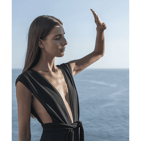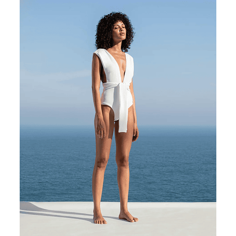 Traje de baño con gran escote en "V" en la parte delantera y posterior. Los cortes en cintura y busto, le dan forma al cuerpo.